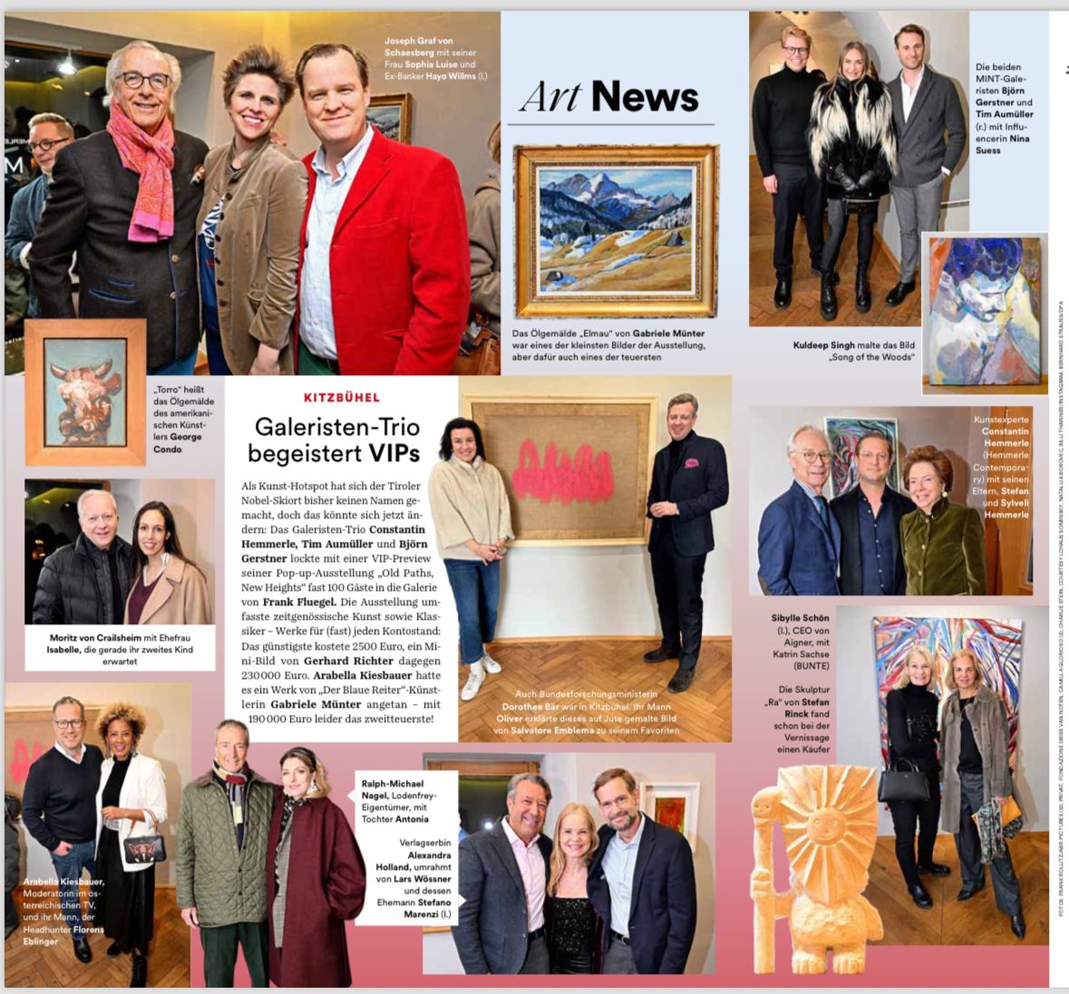 The Tyrolean luxury ski resort has so far not been known as an art hotspot, but that may now be about to change. The gallerist trio Constantin Hemmerle, Tim Aumüller and Björn Gerstner attracted nearly 100 guests to the gallery of Frank Flügel with a VIP preview of their pop-up exhibition “Old Paths, New Heights.”
